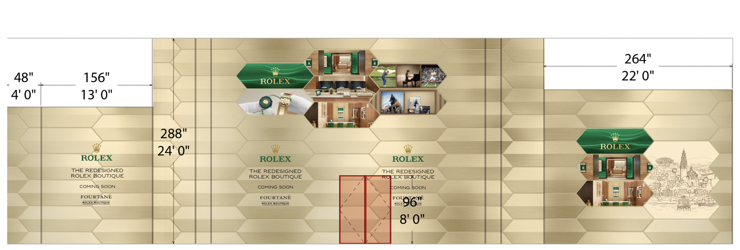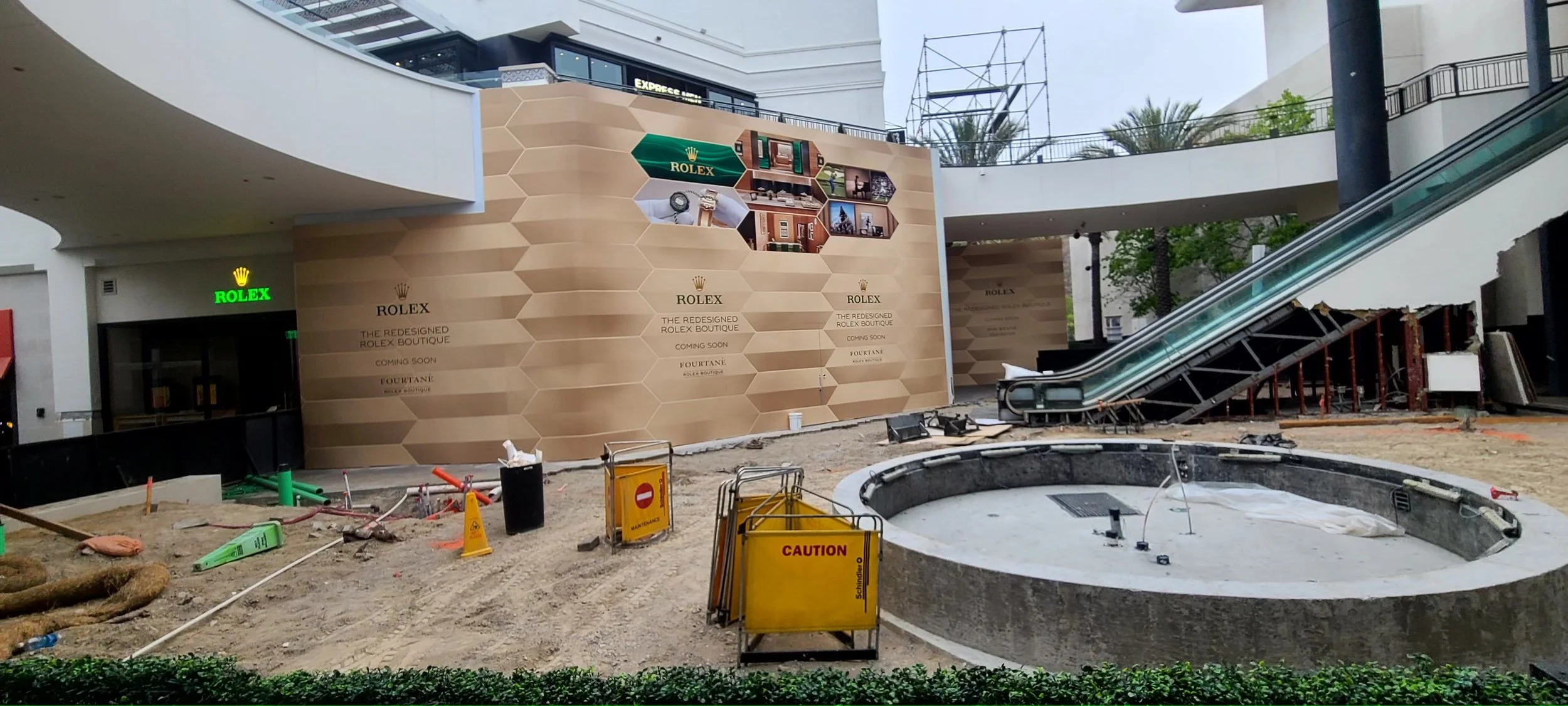 Created premium barricade design for Rolex Boutique Fourtané during renovation in San Diego. Over the years, I've managed over 350 barricades—each one treated as a temporary flagship, designed with precision and aligned with brand integrity. The barricade had to reflect Rolex’s brand prestige while navigating timeline and spatial constraints. Reimagined the barricade as a branded experience—carefully executed through material, type, and layout decisions.